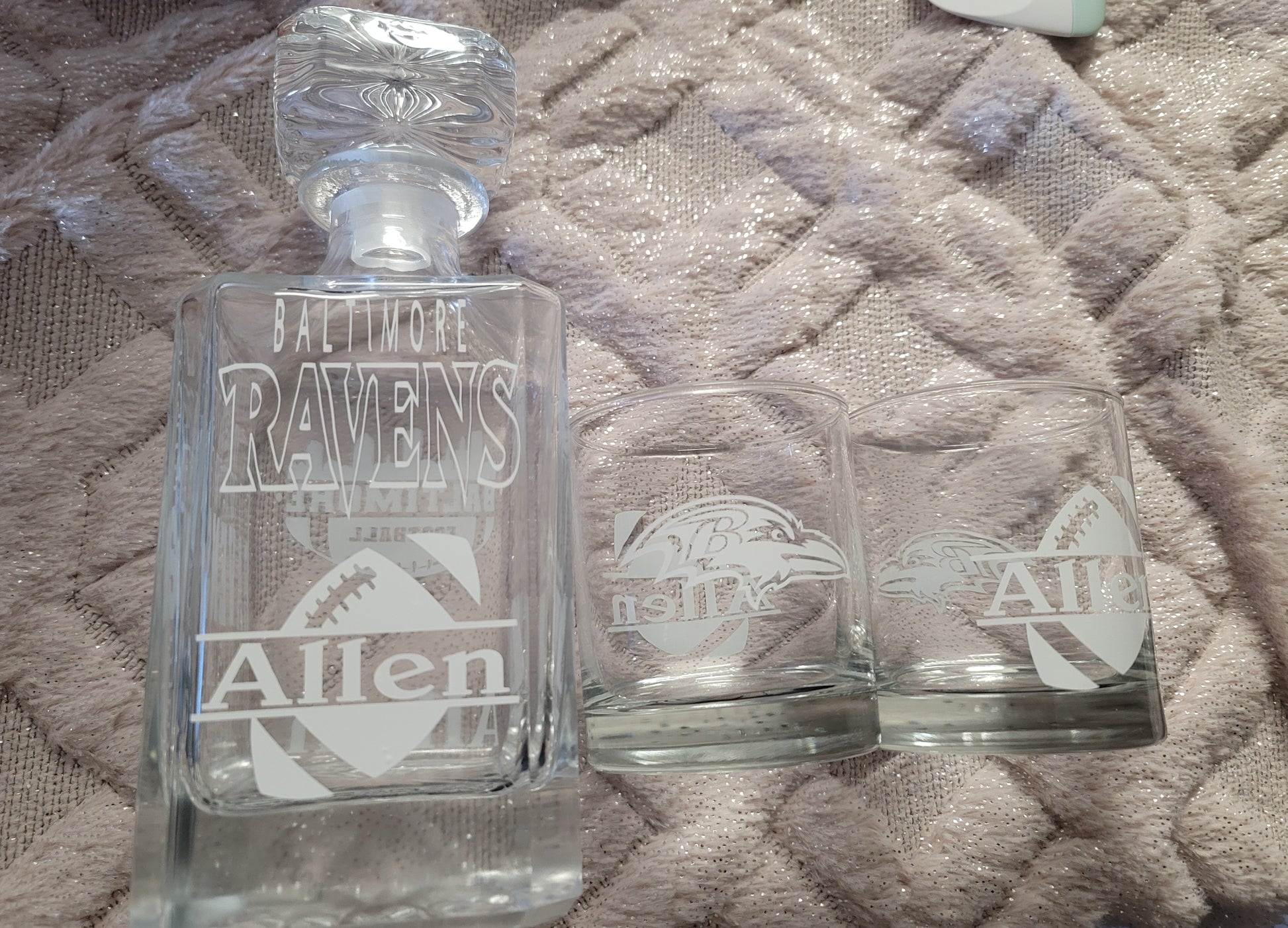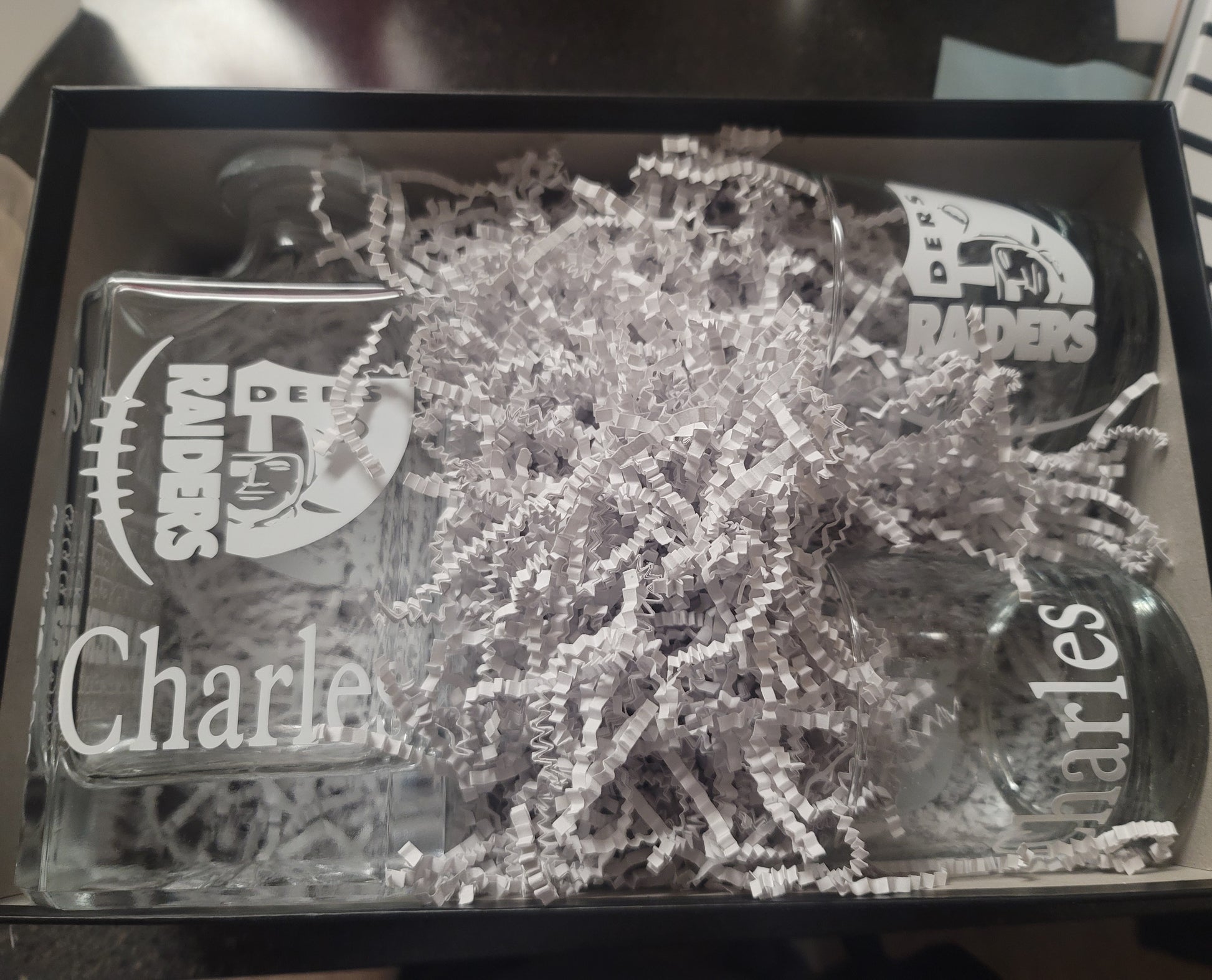 What better gift for a loved one, than a personalized glass decanter. This set comes with one whiskey decanter and 2 whiskey glasses. Personalize with your favorite sports team and/or words